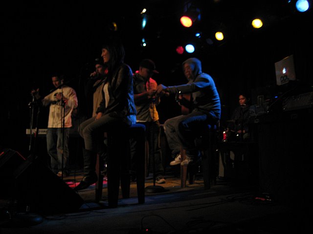 I got these pics from Lily's camera. Thank you Lily, you are awesome. Our last show of 2007. Our set started at 8:30pm, and we all arrived at 7pm to set up, and sound check. But first we ate at Melrose Wok, this spot across the street where they give fortune cookies that teach you Chinese phrases. Then back to The Gig, where we set up everything for our Organic show. The Organic show was more of an intimate set. The venue itself is a bit smaller than we're used to, the stage is lower to the ground, and it has this fun velvet curtain that covered up the stage and then rose up all theatrically when the set began. We played all of our songs with a more acoustic sound...acoustic guitar in place of an electric, less drums, Jay set his keys to a Grand Piano sound. Even us vocalists perched up on stools instead of jumping around on stage all the time.
